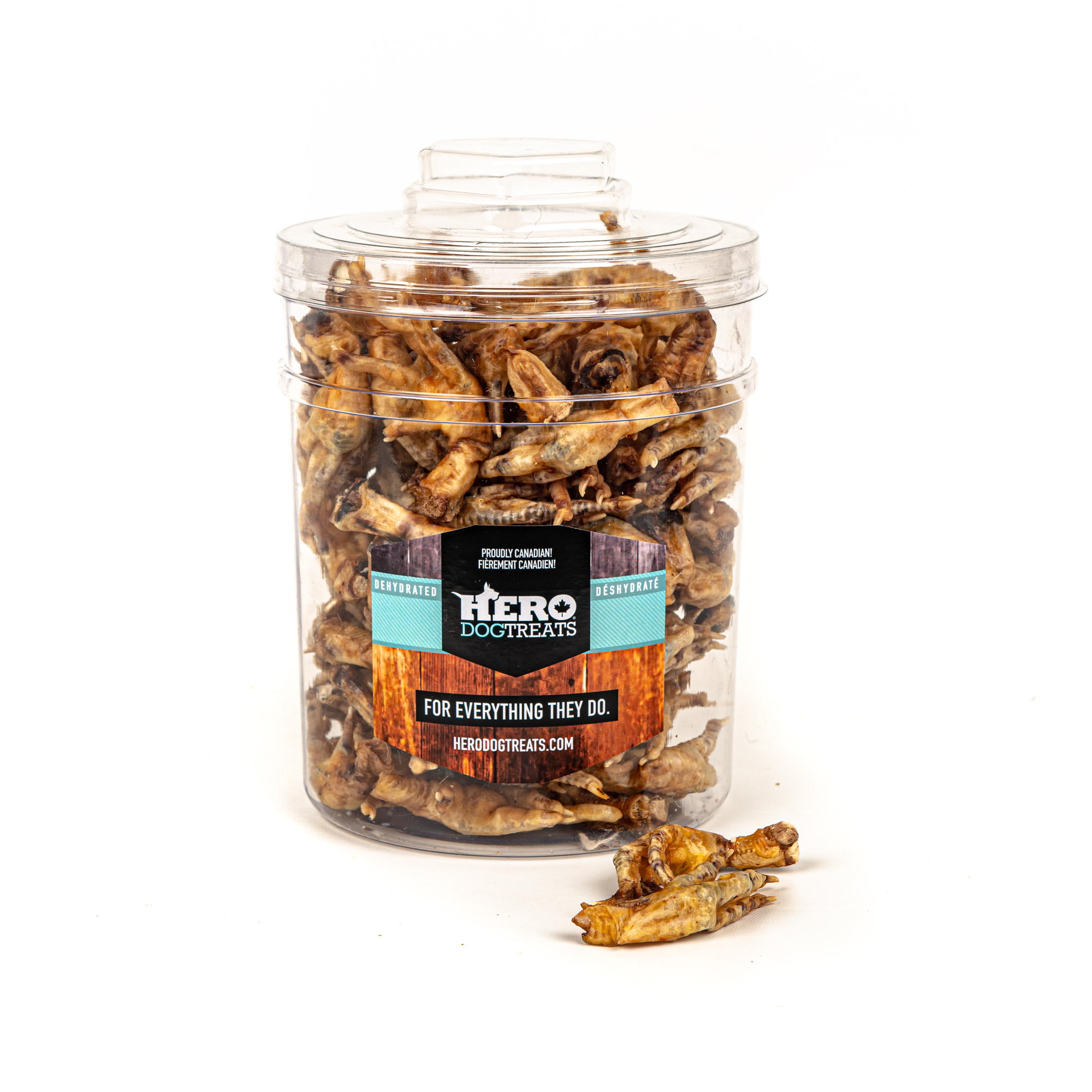 Dehydrated Human Grade Chicken Feet is a worry free treat that is rich in flavour and packed with 100% natural protein.Sold in a bulk bag that can fill HeroDogTreats™ Bulk Jars.These bulk bags are great for those who customers who want a variety of treats while stopping in for their raw meals.